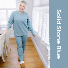 Meet the Cozy Set — where relaxed style meets elevated comfort. Crafted in our ultra-soft Micro Rib Sweater Knit, this matching top-and-bottom duo is designed to make every day feel a little more luxe. The Chris Top features a drop shoulder and oversized fit for that effortlessly laid-back vibe. Side slits at the hem add easy movement and a flattering touch of shape. The Carma Bottom brings the perfect complement with its ribbed waistband, adjustable drawcord, and relaxed full-length leg—giving you a customizable fit with a smooth, elevated silhouette. The Carma Pant has a 29 1/2" inseam and grades up to 31". \r\r Fabric: Micro Rib Sweater Knit — 51% Polyester / 35% Viscose / 14% Nylon. \r\r Sizes: XXS - 3XL